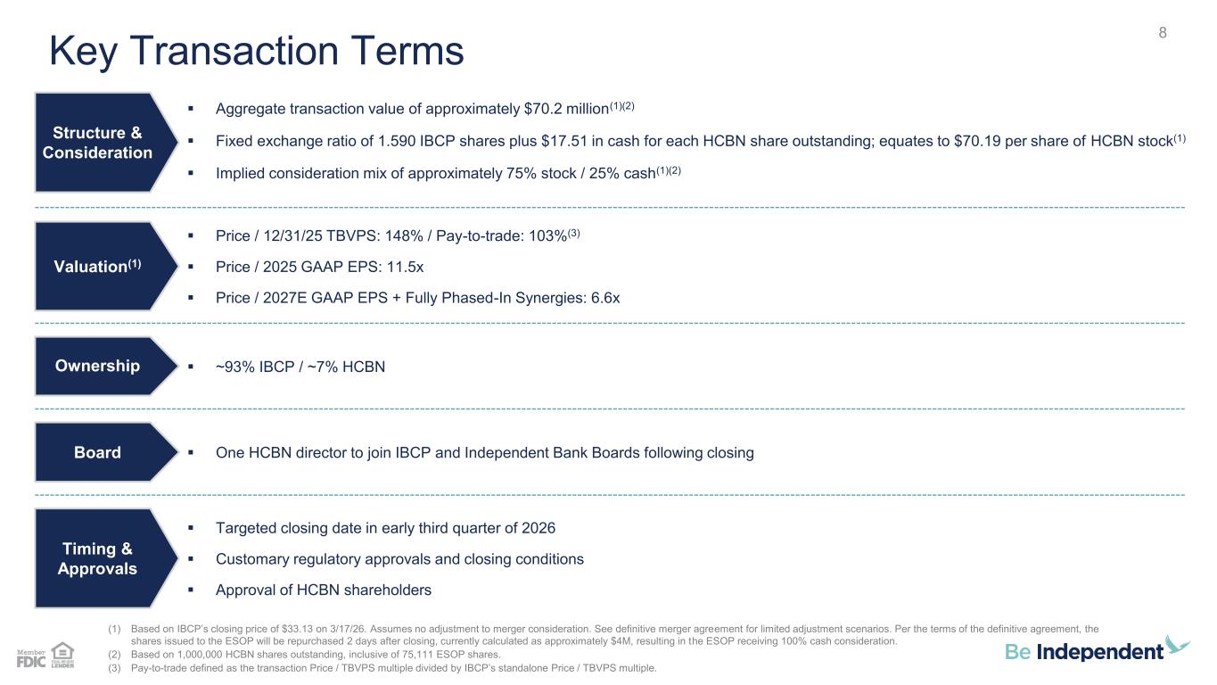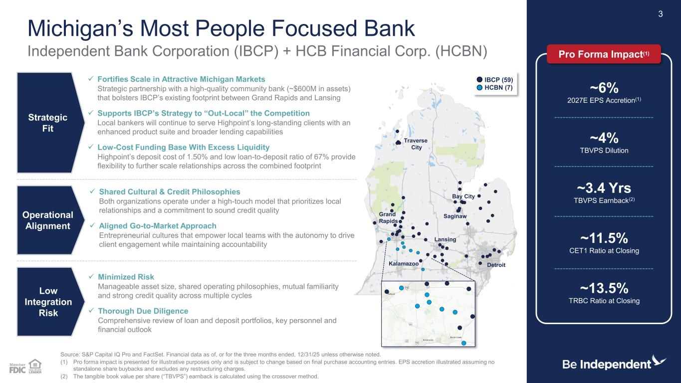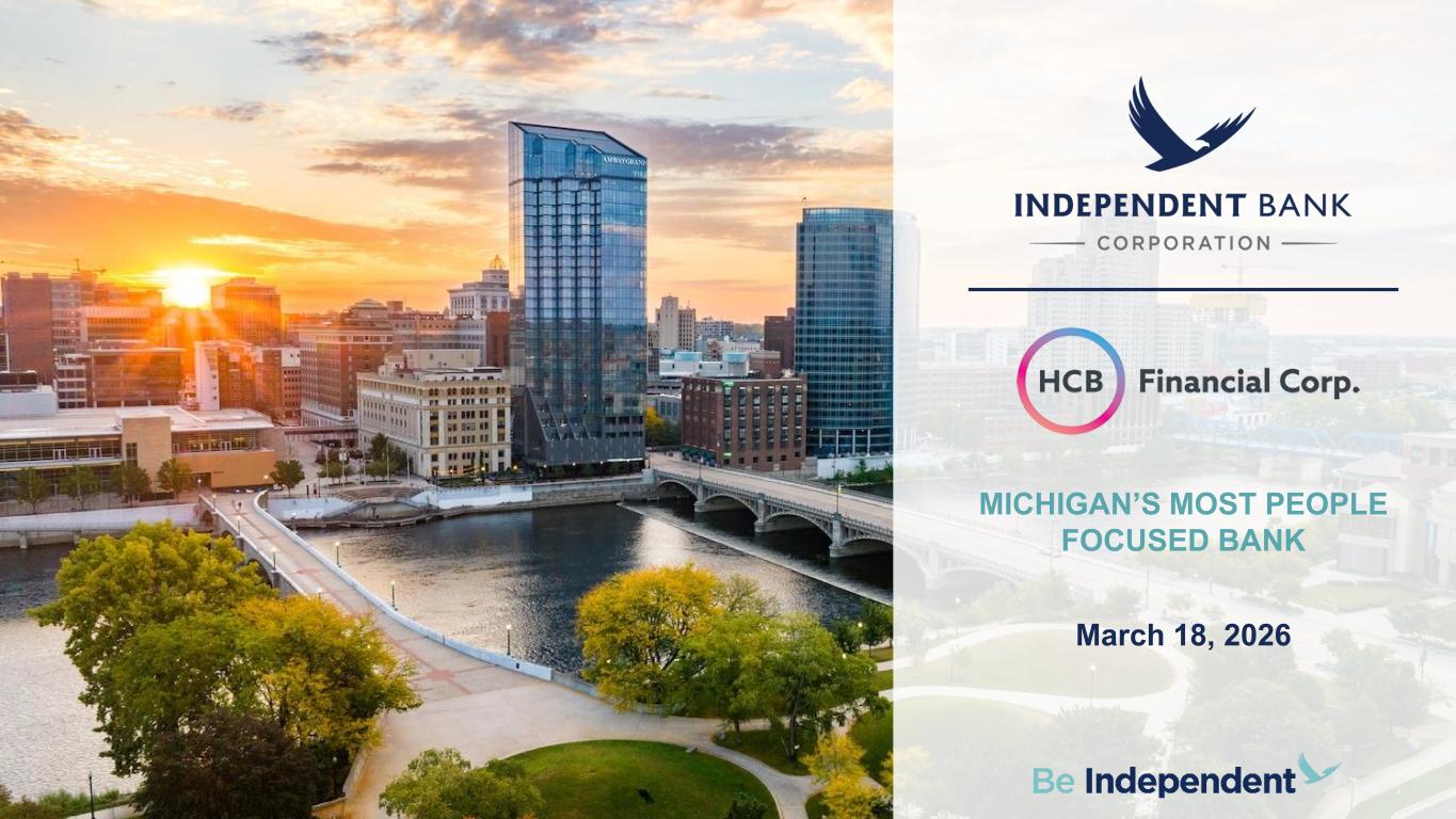 187 31 44 211 212 214 138 192 197 90 166 173 23 42 83 112 18 27 123 136 133 67 129 135 Disclosures 2 Forward Looking Statements This presentation contains certain forward-looking statements about Independent Bank Corporation (“Independent”) and HCB Financial Corp. (“HCB”), such as statements about the timing and expected completion of the proposed merger, its expected effects on the combined organization, and the pro forma impact to Independent. Independent and HCB intend such forward-looking statements to be covered by the safe harbor provisions for forward-looking statements contained in the Private Securities Litigation Reform Act of 1995. Forward-looking statements, which are based on certain assumptions and describe future plans, strategies and expectations of Independent and HCB, are identified by use of the words “pro forma,” “believe,” “expect,” “intend,” “anticipate,” “estimate,” “project,” or similar expressions. Actual results could differ materially from the results indicated by these statements because the realization of those results is subject to many risks and uncertainties, including, among other things, the possibility that the anticipated benefits of the proposed merger will not be realized within the expected time period or at all; the risk that integration of the operations of HCB with Independent will be materially delayed or will be more costly or difficult than expected; the inability to complete the proposed merger due to the failure to satisfy the various conditions to closing, including failure to obtain the required regulatory and shareholder approvals; the failure of the proposed merger to close for any other reason; the effect of the announcement of the proposed merger on customer relationships and operating results; the possibility that the proposed merger may be more expensive to complete than anticipated, including as a result of unexpected factors or events; difficulties associated with achieving future financial results; and the inaccuracy or failure of any one or more of the assumptions set forth in this presentation. Additional information concerning Independent, including additional factors and risks that could materially affect Independent’s financial results, are included in Independent’s filings with the SEC, including its Annual Reports on Form 10-K, Quarterly Reports on Form 10-Q, and Current Reports on Form 8-K. Forward-looking statements speak only as of the date they are made. All subsequent written and oral forward-looking statements concerning the proposed merger or other matters attributable to Independent or HCB or any person acting on their behalf are expressly qualified in their entirety by the cautionary statements above. Except as required by law, neither Independent nor HCB undertake any obligation to update any forward-looking information contained in this document, whether as a result of new information, future events, or otherwise. Additional Information and Where to Find It In connection with the proposed merger, Independent expects to file with the SEC a registration statement on Form S-4 that will include a preliminary proxy statement of HCB and a preliminary prospectus of Independent, as well as other relevant documents concerning the proposed merger. After the registration statement is declared effective by the SEC, HCB will mail a definitive proxy statement/prospectus to its shareholders. This presentation is not a substitute for the proxy statement/prospectus or registration statement or for any other document that Independent may file with the SEC or that HCB may send to its shareholders in connection with the proposed merger. Shareholders of HCB are urged to carefully read the registration statement and accompanying proxy statement/prospectus regarding the proposed merger when it becomes available and any other relevant documents filed with the SEC, as well as any amendments or supplements to those documents, because they will contain important information. Free copies of the proxy statement/prospectus included in the registration statement, as well as other filings containing information about Independent, HCB, and the proposed merger, may be obtained at the SEC’s website: www.sec.gov. You will also be able to obtain these documents, free of charge, from Independent at www.independentbank.com under the tab “Investor Relations” and then “Financials - SEC Filings.” The information available through Independent’s website is not and shall not be deemed part of this presentation or incorporated by reference into other filings Independent makes with the SEC. Alternatively, when available, these documents can be obtained free of charge from Independent upon written request to Independent Bank Corporation, 4200 East Beltline, Grand Rapids, MI 49525, Attention: Investor Relations; or from HCB upon written request to HCB Financial Corp., 150 West Court Street, Hastings, MI 49058, Attention: Amanda Belcher-Currier, CFO. A final proxy statement/prospectus will be mailed to the shareholders of HCB. Participants in the Solicitation Under SEC rules, Independent, HCB, and certain of their respective directors and executive officers, may be deemed to be participants in the solicitation of proxies from HCB’s shareholders in favor of the approval of the definitive merger agreement. Information about such directors and executive officers of Independent and their direct or indirect interests, by security holdings or otherwise, can be found in Independent’s proxy statement in connection with its 2026 annual meeting of shareholders, as filed with the SEC on March 6, 2026, and other documents subsequently filed by Independent with the SEC. To the extent holdings of common stock by its directors or executive officers have changed since the amounts set forth in Independent’s proxy statement in connection with its 2026 annual meeting of shareholders, such changes have been or will be reflec