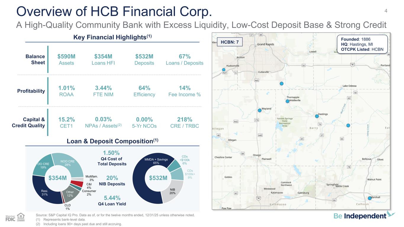 187 31 44 211 212 214 138 192 197 90 166 173 23 42 83 112 18 27 123 136 133 67 129 135 Michigan’s Most People Focused Bank Independent Bank Corporation (IBCP) + HCB Financial Corp. (HCBN) Source: S&P Capital IQ Pro and FactSet. Financial data as of, or for the three months ended, 12/31/25 unless otherwise noted. (1) Pro forma impact is presented for illustrative purposes only and is subject to change based on final purchase accounting entries. EPS accretion illustrated assuming no standalone share buybacks and excludes any restructuring charges. (2) The tangible book value per share (“TBVPS”) earnback is calculated using the crossover method. IBCP (59) HCBN (7) 3 Detroit Grand Rapids Lansing Traverse City Kalamazoo Bay City Saginaw Pro Forma Impact(1) Strategic Fit Operational Alignment Low Integration Risk ✓ Fortifies Scale in Attractive Michigan Markets Strategic partnership with a high-quality community bank (~$600M in assets) that bolsters IBCP’s existing footprint between Grand Rapids and Lansing ✓ Supports IBCP’s Strategy to “Out-Local” the Competition Local bankers will continue to serve Highpoint’s long-standing clients with an enhanced product suite and broader lending capabilities ✓ Low-Cost Funding Base With Excess Liquidity Highpoint’s deposit cost of 1.50% and low loan-to-deposit ratio of 67% provide flexibility to further scale relationships across the combined footprint ✓ Shared Cultural & Credit Philosophies Both organizations operate under a high-touch model that prioritizes local relationships and a commitment to sound credit quality ✓ Aligned Go-to-Market Approach Entrepreneurial cultures that empower local teams with the autonomy to drive client engagement while maintaining accountability ✓ Minimized Risk Manageable asset size, shared operating philosophies, mutual familiarity and strong credit quality across multiple cycles ✓ Thorough Due Diligence Comprehensive review of loan and deposit portfolios, key personnel and financial outlook ~6% 2027E EPS Accretion(1) ~4% TBVPS Dilution ~3.4 Yrs TBVPS Earnback(2) ~11.5% CET1 Ratio at Closing ~13.5% TRBC Ratio at Closing