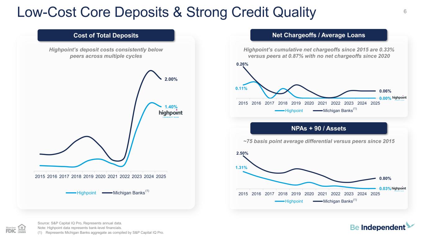 187 31 44 211 212 214 138 192 197 90 166 173 23 42 83 112 18 27 123 136 133 67 129 135 5Attractive Michigan Markets Enhancing IBCP’s Existing Footprint In Central Michigan Source: S&P Capital IQ Pro. Deposit data per FDIC summary of deposits as of 6/30/25. Market rankings are pro forma for pending or recently completed acquisitions. Barry County Calhoun County Allegan County 3 HCB Branches $476M Deposits 1st Market Rank $90k Median HHI 9.6% ‘26 – ‘31 HHI Δ Kent County Ottawa County 1 HCB Branch $66M Deposits 5th Market Rank $64k Median HHI 6.4% ‘26 – ‘31 HHI Δ 1 HCB Branch $38M Deposits 6th Market Rank $87k Median HHI 9.6% ‘26 – ‘31 HHI Δ 1 HCB Branch $25M Deposits 23rd Market Rank $89k Median HHI 12.0% ‘26 – ‘31 HHI Δ 1 New HCB Branch Opening In Q1 2026