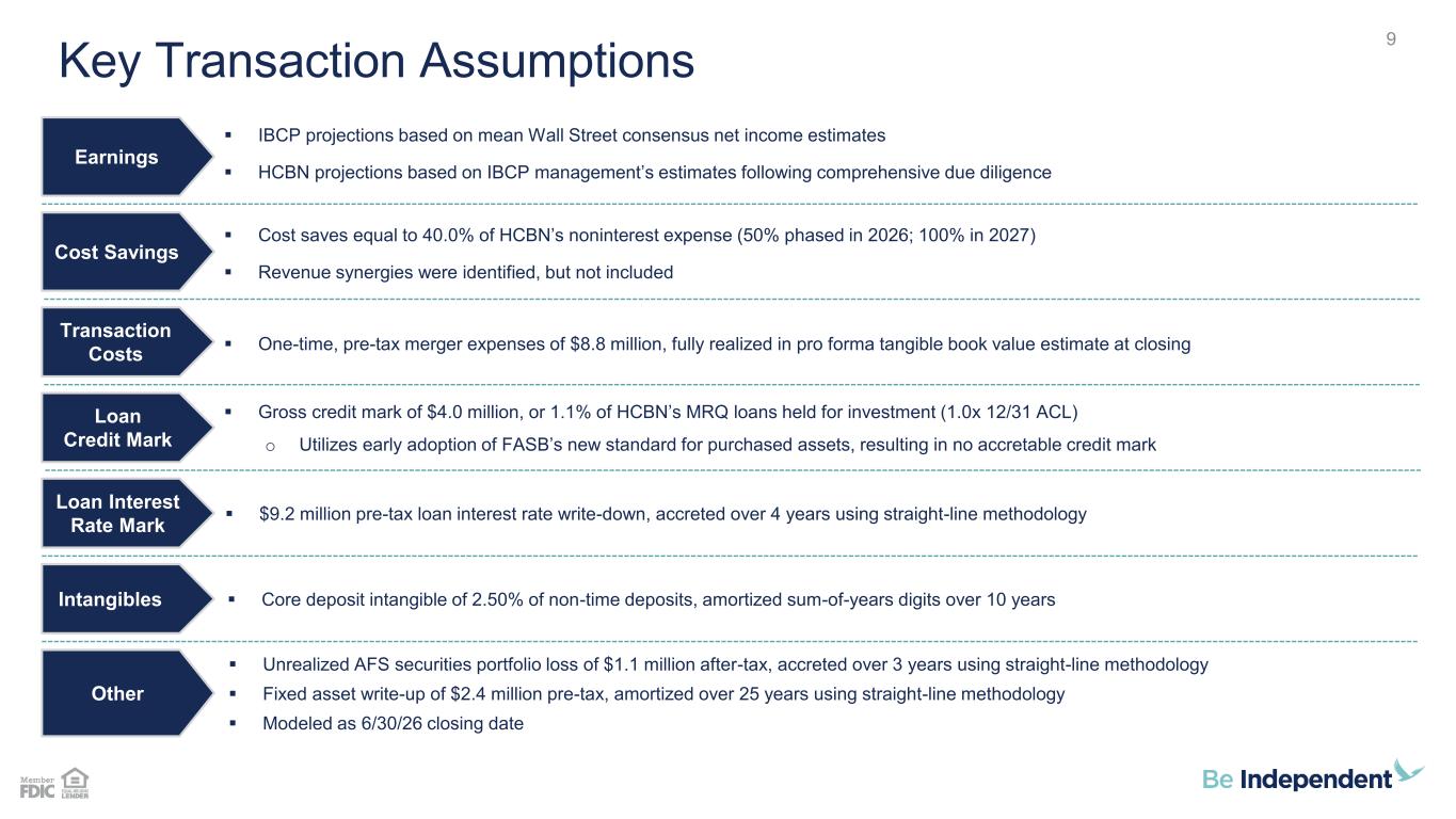 187 31 44 211 212 214 138 192 197 90 166 173 23 42 83 112 18 27 123 136 133 67 129 135 Key Transaction Terms (1) Based on IBCP’s closing price of $33.13 on 3/17/26. Assumes no adjustment to merger consideration. See definitive merger agreement for limited adjustment scenarios. Per the terms of the definitive agreement, the shares issued to the ESOP will be repurchased 2 days after closing, currently calculated as approximately $4M, resulting in the ESOP receiving 100% cash consideration. (2) Based on 1,000,000 HCBN shares outstanding, inclusive of 75,111 ESOP shares. (3) Pay-to-trade defined as the transaction Price / TBVPS multiple divided by IBCP’s standalone Price / TBVPS multiple. 8 ▪ Aggregate transaction value of approximately $70.2 million(1)(2) ▪ Fixed exchange ratio of 1.590 IBCP shares plus $17.51 in cash for each HCBN share outstanding; equates to $70.19 per share of HCBN stock(1) ▪ Implied consideration mix of approximately 75% stock / 25% cash(1)(2) Structure & Consideration ▪ Price / 12/31/25 TBVPS: 148% / Pay-to-trade: 103%(3) ▪ Price / 2025 GAAP EPS: 11.5x ▪ Price / 2027E GAAP EPS + Fully Phased-In Synergies: 6.6x Valuation(1) ▪ ~93% IBCP / ~7% HCBNOwnership ▪ One HCBN director to join IBCP and Independent Bank Boards following closingBoard Timing & Approvals ▪ Targeted closing date in early third quarter of 2026 ▪ Customary regulatory approvals and closing conditions ▪ Approval of HCBN shareholders 8