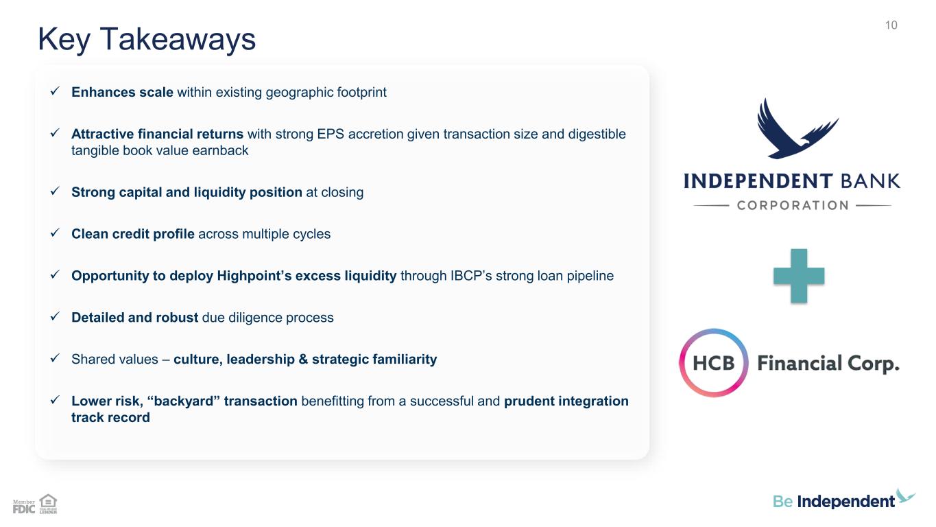 187 31 44 211 212 214 138 192 197 90 166 173 23 42 83 112 18 27 123 136 133 67 129 135 Key Transaction Assumptions 9 ▪ IBCP projections based on mean Wall Street consensus net income estimates ▪ HCBN projections based on IBCP management’s estimates following comprehensive due diligence Earnings ▪ Cost saves equal to 40.0% of HCBN’s noninterest expense (50% phased in 2026; 100% in 2027) ▪ Revenue synergies were identified, but not included Cost Savings ▪ One-time, pre-tax merger expenses of $8.8 million, fully realized in pro forma tangible book value estimate at closing Transaction Costs ▪ Gross credit mark of $4.0 million, or 1.1% of HCBN’s MRQ loans held for investment (1.0x 12/31 ACL) o Utilizes early adoption of FASB’s new standard for purchased assets, resulting in no accretable credit mark Loan Credit Mark ▪ $9.2 million pre-tax loan interest rate write-down, accreted over 4 years using straight-line methodology Loan Interest Rate Mark ▪ Core deposit intangible of 2.50% of non-time deposits, amortized sum-of-years digits over 10 yearsIntangibles ▪ Unrealized AFS securities portfolio loss of $1.1 million after-tax, accreted over 3 years using straight-line methodology ▪ Fixed asset write-up of $2.4 million pre-tax, amortized over 25 years using straight-line methodology ▪ Modeled as 6/30/26 closing date Other 9
