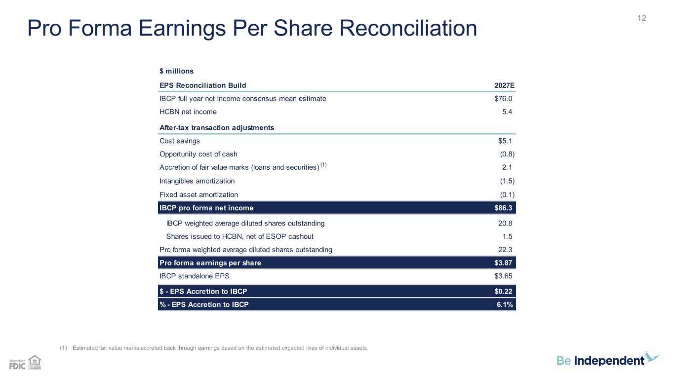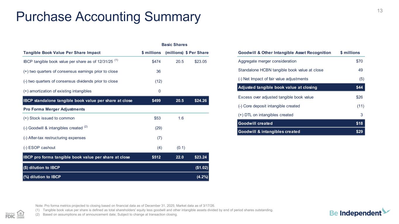 187 31 44 211 212 214 138 192 197 90 166 173 23 42 83 112 18 27 123 136 133 67 129 135 Pro Forma Earnings Per Share Reconciliation 12 12 $ millions EPS Reconciliation Build 2027E IBCP full year net income consensus mean estimate $76.0 HCBN net income 5.4 After-tax transaction adjustments Cost savings $5.1 Opportunity cost of cash (0.8) Accretion of fair value marks (loans and securities) 2.1 Intangibles amortization (1.5) Fixed asset amortization (0.1) IBCP pro forma net income $86.3 IBCP weighted average diluted shares outstanding 20.8 Shares issued to HCBN, net of ESOP cashout 1.5 Pro forma weighted average diluted shares outstanding 22.3 Pro forma earnings per share $3.87 IBCP standalone EPS $3.65 $ - EPS Accretion to IBCP $0.22 % - EPS Accretion to IBCP 6.1% (1) (1) Estimated fair value marks accreted back through earnings based on the estimated expected lives of individual assets.